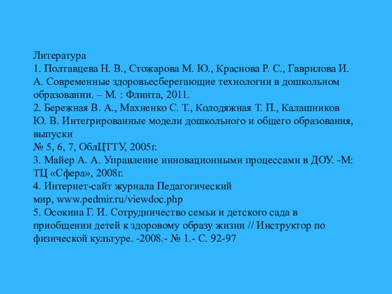 5. Осокина Г. И. Сотрудничество семьи и детского сада в приобщении детей к здоровому образу жизни // Инструктор по физической культуре. -2008.- № 1.- С. 92-97