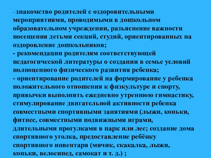 - ориентирование родителей на формирование у ребенка положительного отношения к физкультуре и спорту, привычки выполнять ежедневно утреннюю гимнастику, стимулирование двигательной активности ребенка совместными спортивными занятиями (лыжи, коньки, фитнес, совместными подвижными играми, длительными прогулками в парк или лес; создание дома спортивного уголка, предоставление ребёнку спортивного инвентаря (мячик, скакалка, лыжи, коньки, велосипед, самокат и т. д.) ;