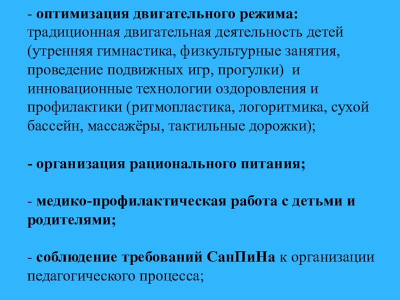 Слайд 7- оптимизация двигательного режима: традиционная двигательная деятельность детей (утренняя гимнастика, физкультурные