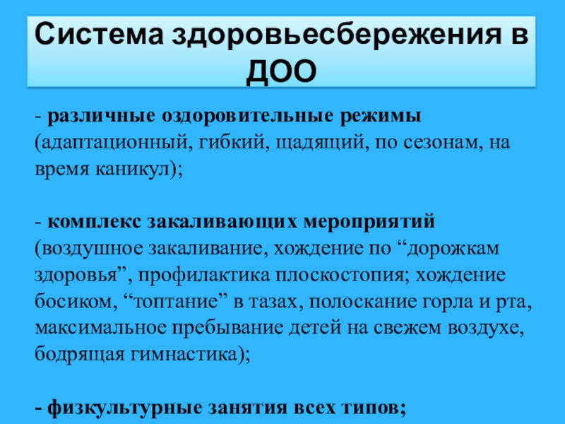 - различные оздоровительные режимы (адаптационный, гибкий, щадящий, по