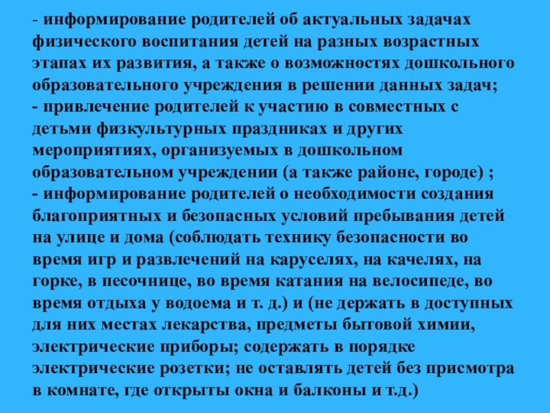 Слайд 12- информирование родителей об актуальных задачах физического воспитания детей на разных