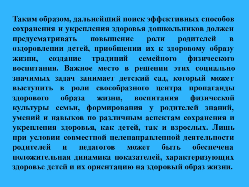 Слайд 30Таким образом, дальнейший поиск эффективных способов сохранения и укрепления здоровья дошкольников