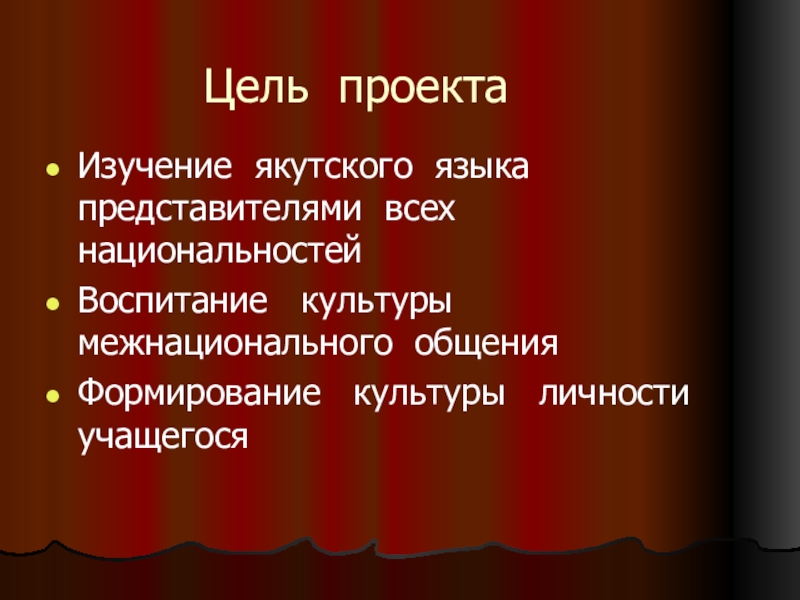 Цель проектаИзучение якутского языка  представителями всех национальностейВоспитание  культуры межнационального общенияФормирование  культуры  личности