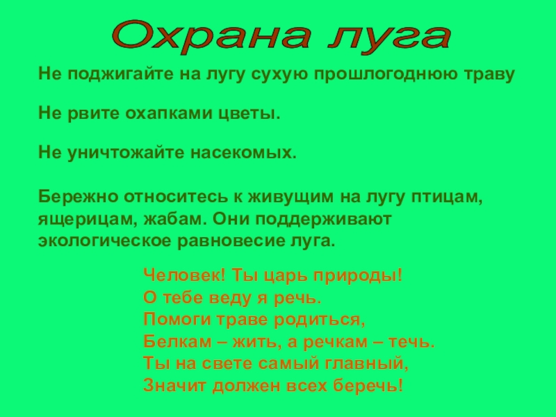 Бережно относитесь к живущим на лугу птицам, ящерицам, жабам. Они поддерживают экологическое равновесие луга.