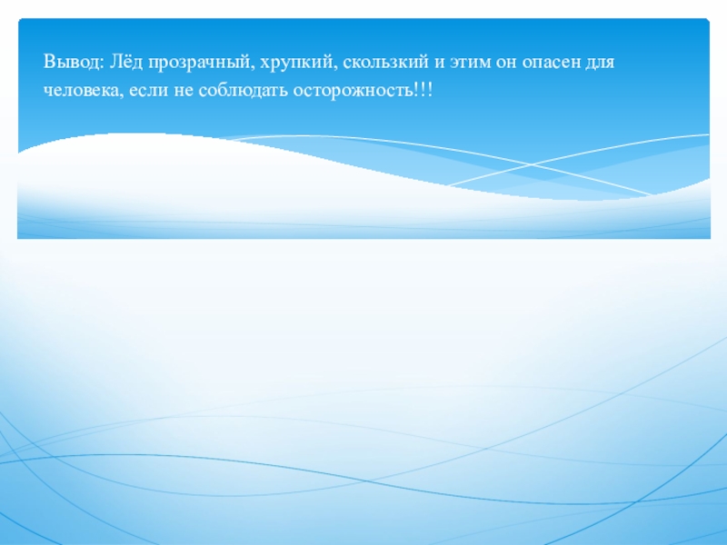Слайд 5Вывод: Лёд прозрачный, хрупкий, скользкий и этим он опасен для человека,