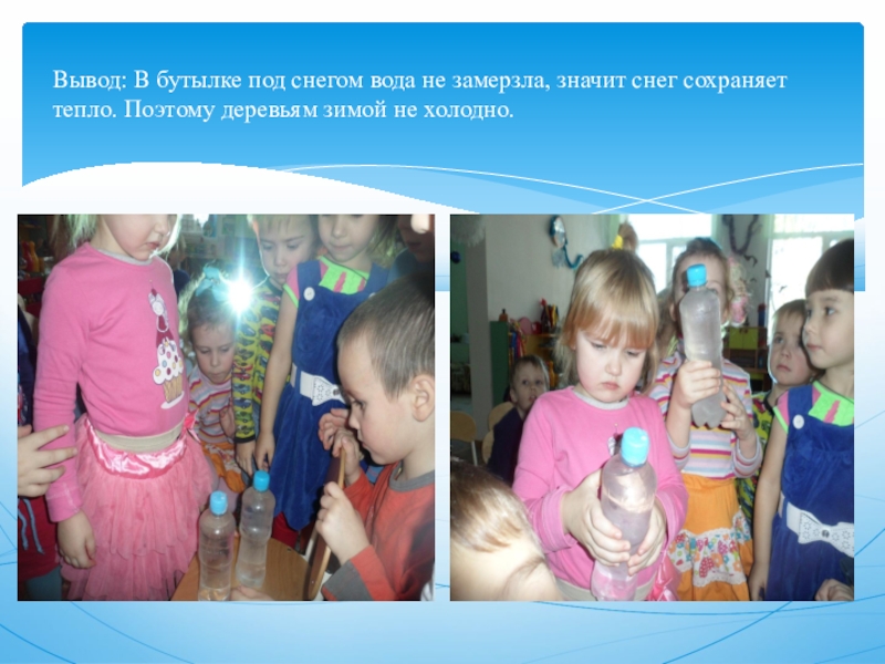 Слайд 10Вывод: В бутылке под снегом вода не замерзла, значит снег сохраняет