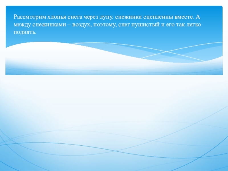 Слайд 14Рассмотрим хлопья снега через лупу. снежинки сцепленны вместе. А между снежинками –