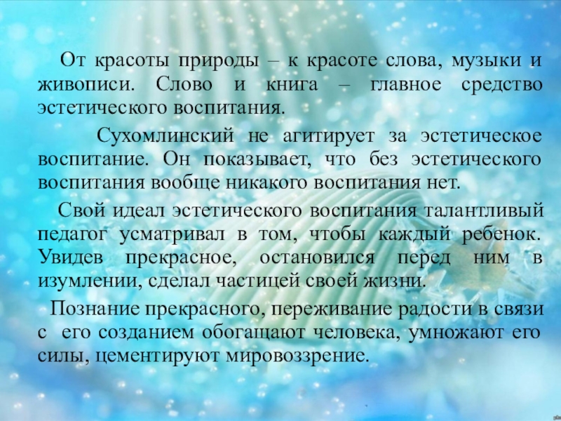 Свой идеал эстетического воспитания талантливый педагог усматривал в том, чтобы каждый ребенок. Увидев прекрасное, остановился перед ним в изумлении, сделал частицей своей жизни.