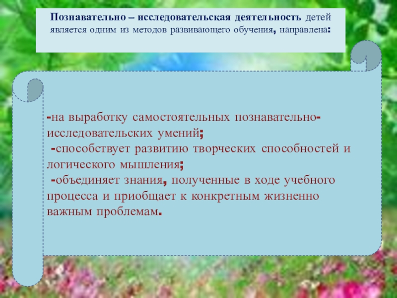 Познавательно – исследовательская деятельность детей является одним из методов развивающего обучения, направлена:
