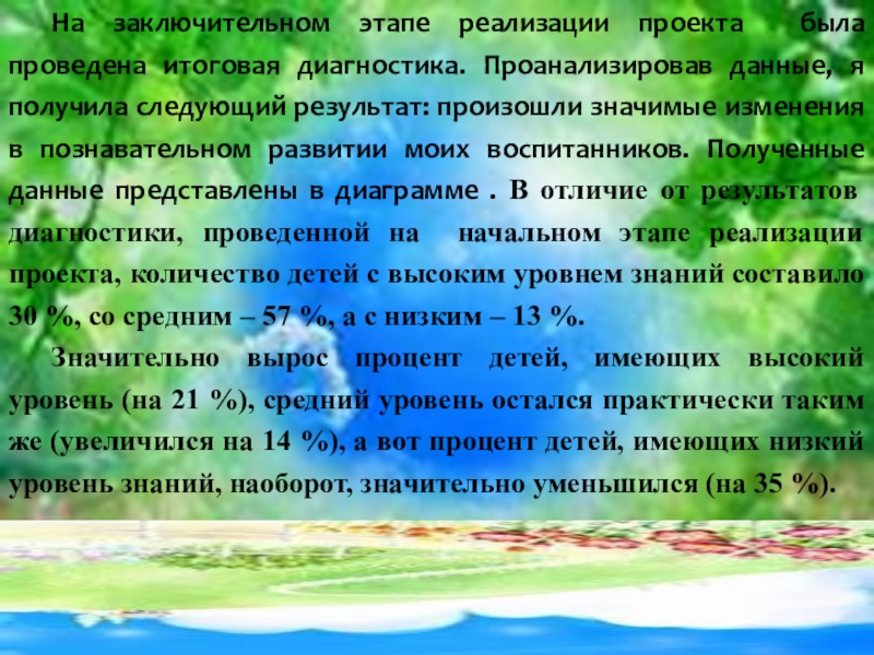Результаты проделанной работы подтверждают тот факт , что экспериментальная деятельность вызывает большой интерес у детей и является средством, помогающим ребёнку самостоятельно освоить исследовательскую деятельность, а так же выстроить отношения между воспитателем и детьми на основе партнерства, повышает уровень экологической культуры у детей, формирует осознанно правильное отношение к объектам и явлениям природы.