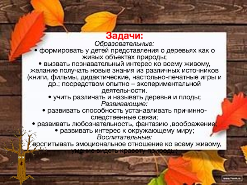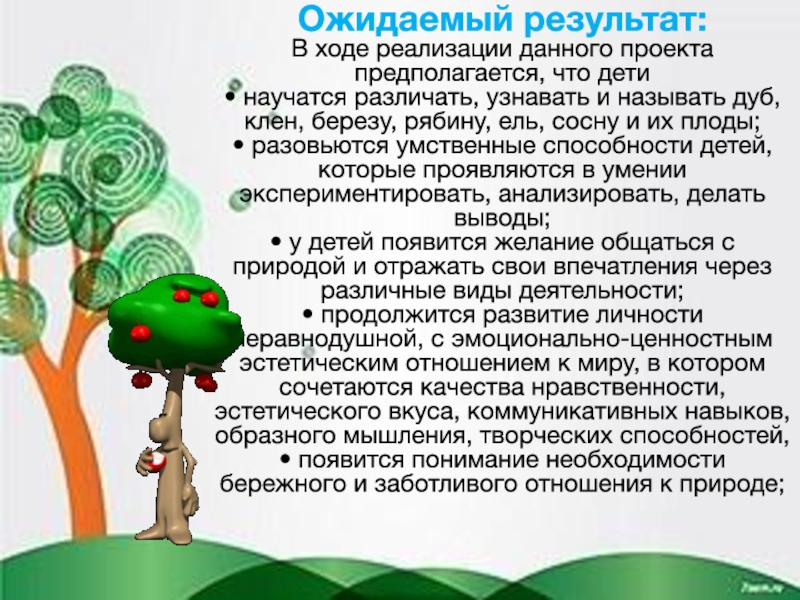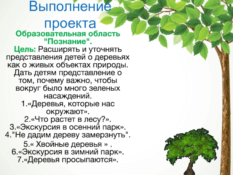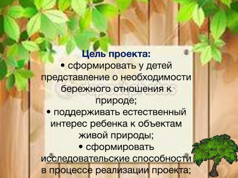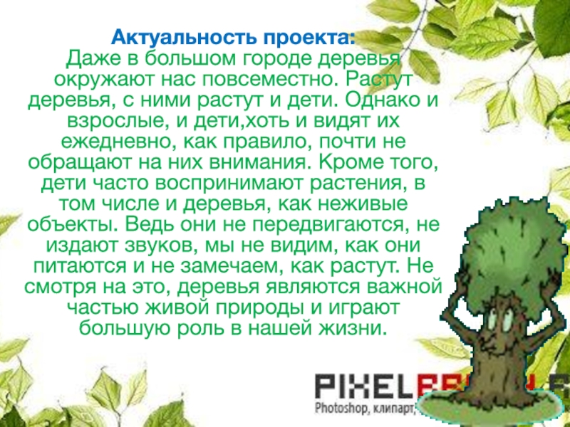 с ними растут и дети. Однако и взрослые, и дети,хоть и видят их ежедневно, как правило, почти не обращают на них внимания. Кроме того, дети часто воспринимают растения, в том числе и деревья, как неживые объекты. Ведь они не передвигаются, не издают звуков, мы не видим, как они питаются и не замечаем, как растут. Не смотря на это, деревья являются важной частью живой природы и играют большую роль в нашей жизни.