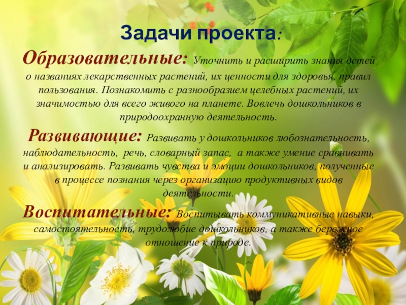 Задачи проекта:  Образовательные: Уточнить и расширить знания детей о названиях лекарственных растений, их ценности