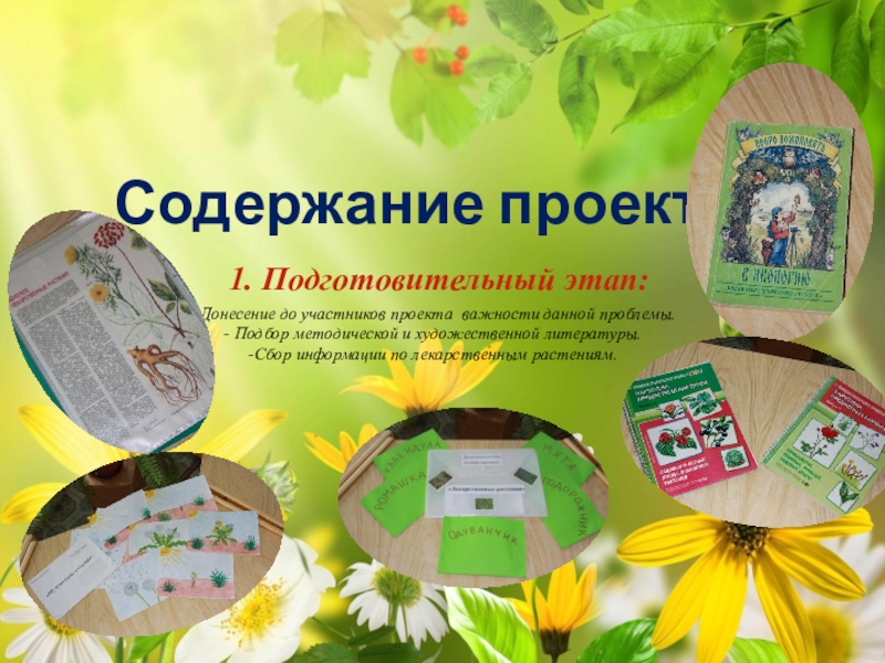 проблемы. - Подбор методической и художественной литературы. -Сбор информации по лекарственным растениям.