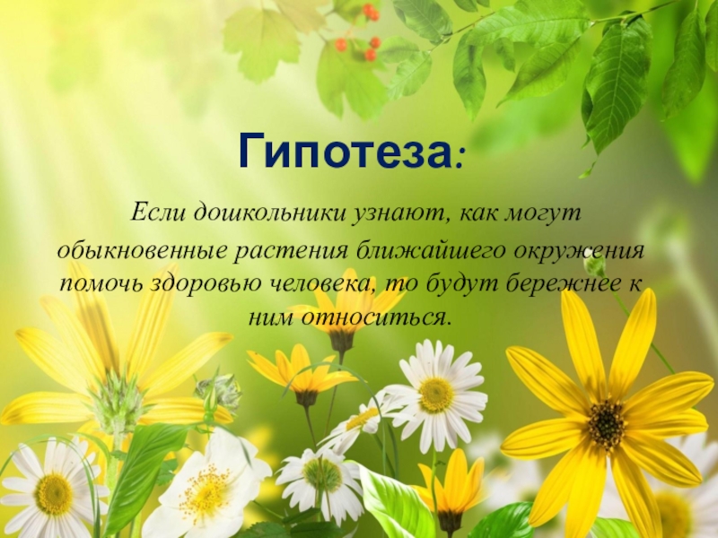 Слайд 5Гипотеза: Если дошкольники узнают, как могут обыкновенные растения ближайшего окружения помочь