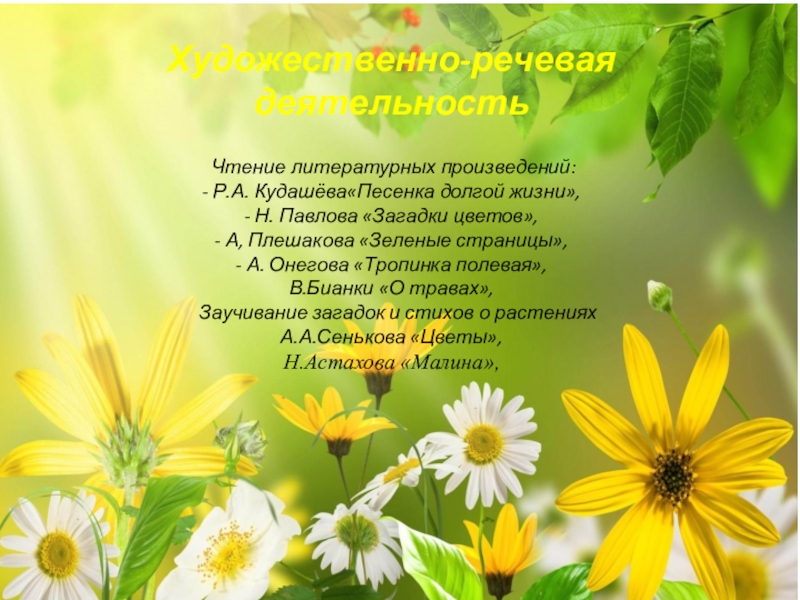 Слайд 16 Художественно-речевая деятельность  Чтение литературных произведений: - Р.А. Кудашёва«Песенка долгой жизни», - Н.