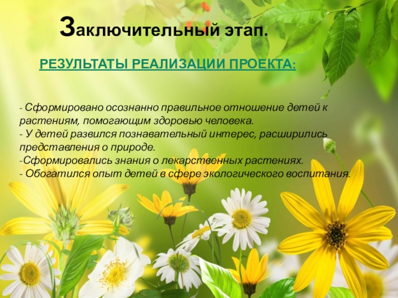 Заключительный этап.  	Результаты реализации проекта:    - Сформировано осознанно правильное отношение детей к растениям, помогающим здоровью