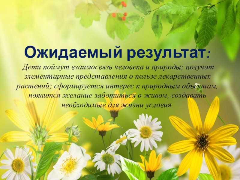 Ожидаемый результат:  Дети поймут взаимосвязь человека и природы; получат элементарные представления о пользе лекарственных растений; сформируется