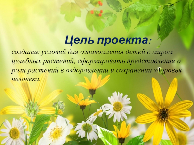 Цель проекта: создание условий для ознакомления детей с миром целебных растений, сформировать представления о роли растений в оздоровлении и сохранении здоровья человека.