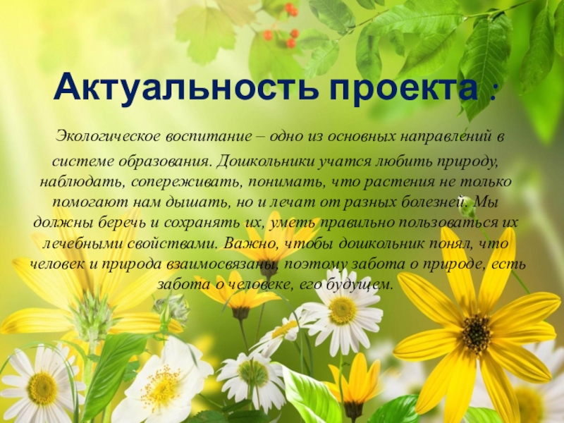 Актуальность проекта : Экологическое воспитание – одно из основных направлений в системе образования. Дошкольники учатся любить природу, наблюдать, сопереживать, понимать, что растения не только помогают нам дышать, но и лечат от разных болезней. Мы должны