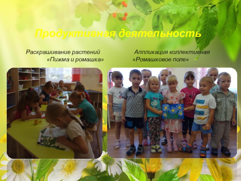 Слайд 14 Продуктивная деятельность  Раскрашивание растений Аппликация коллективная «Пижма и ромашка» «Ромашковое поле»
