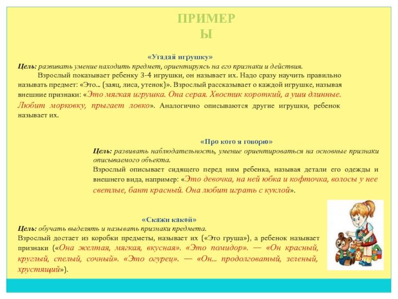 Взрослый описывает сидящего перед ним ребенка, называя детали его одежды и внешнего вида, например: «Это девочка, на ней юбка и кофточка, волосы у нее светлые, бант красный. Она любит играть с куклой».