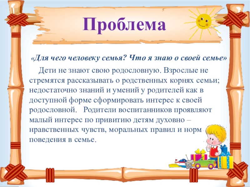 Обогатить знания детей о своей семье, о нравственном отношении к членам семьи, семейным традициям, проявлять заботу о родных людях.