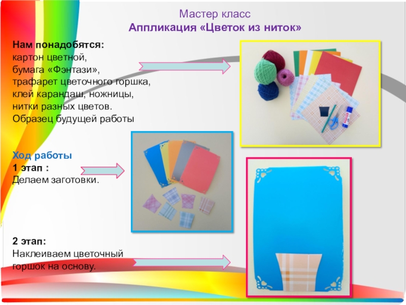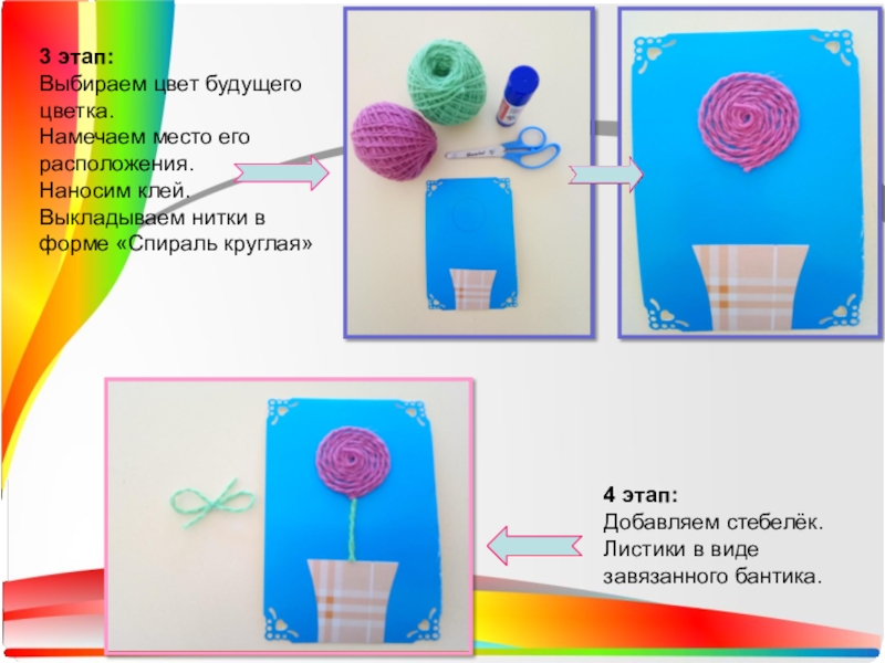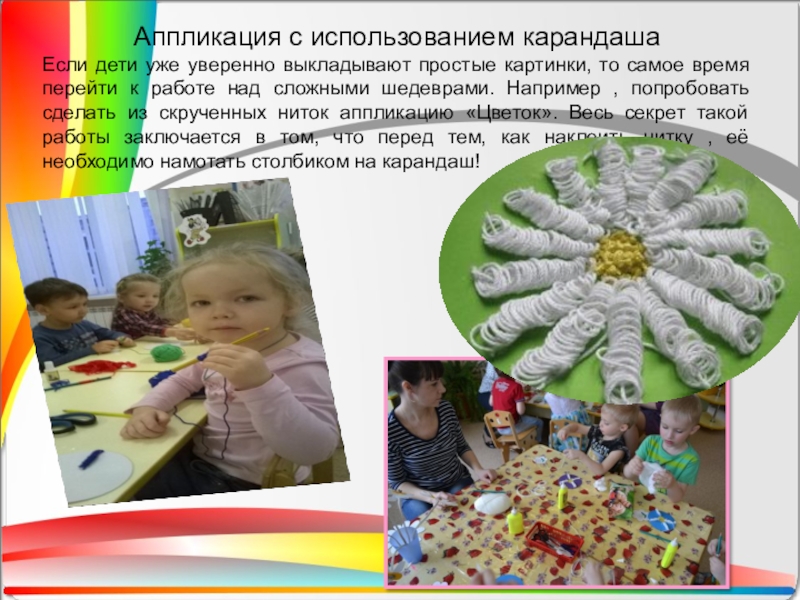 самое время перейти к работе над сложными шедеврами. Например , попробовать сделать из скрученных ниток аппликацию «Цветок». Весь секрет такой работы заключается в том, что перед тем, как наклеить нитку , её необходимо намотать столбиком на карандаш!