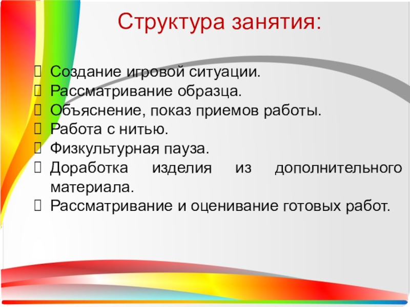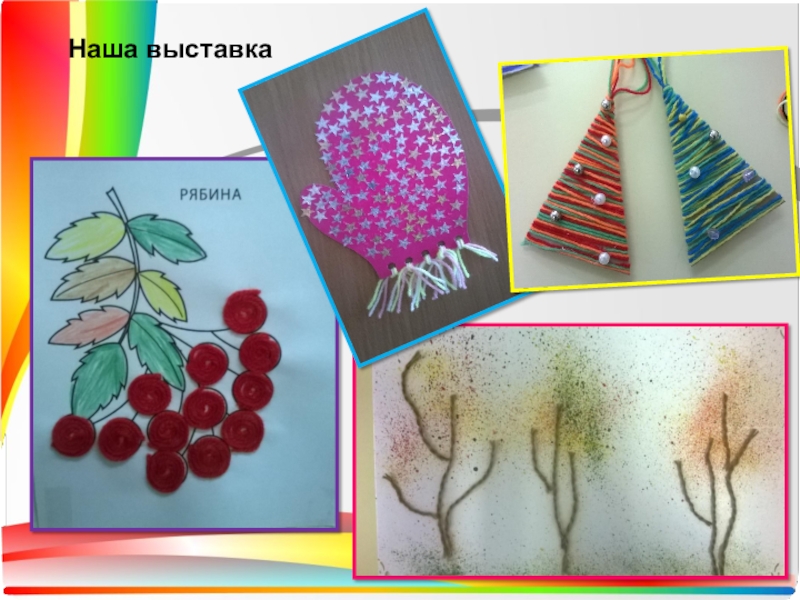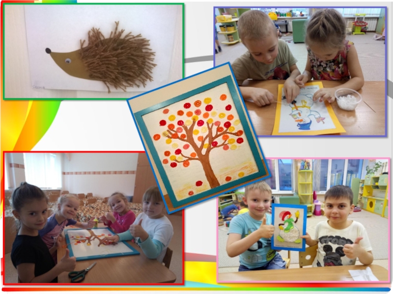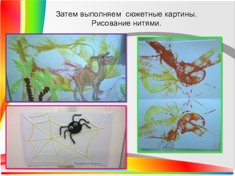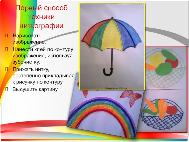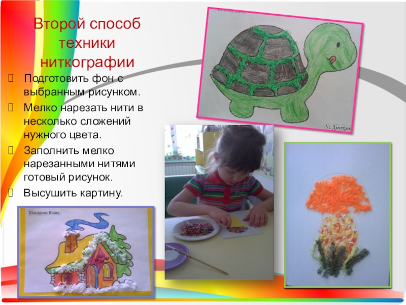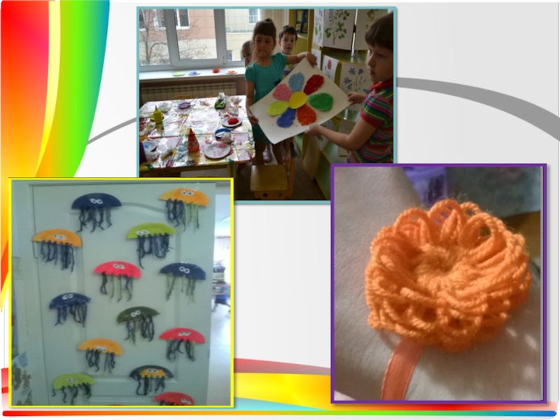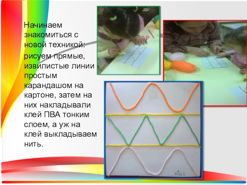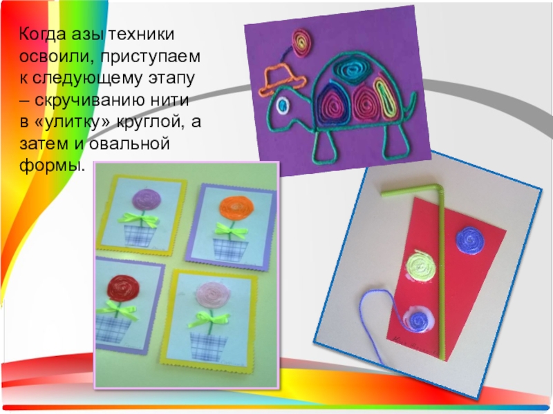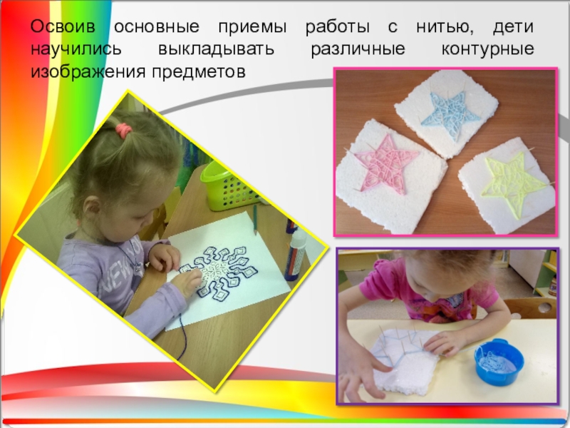 Слайд 13Освоив основные приемы работы с нитью, дети научились выкладывать различные контурные