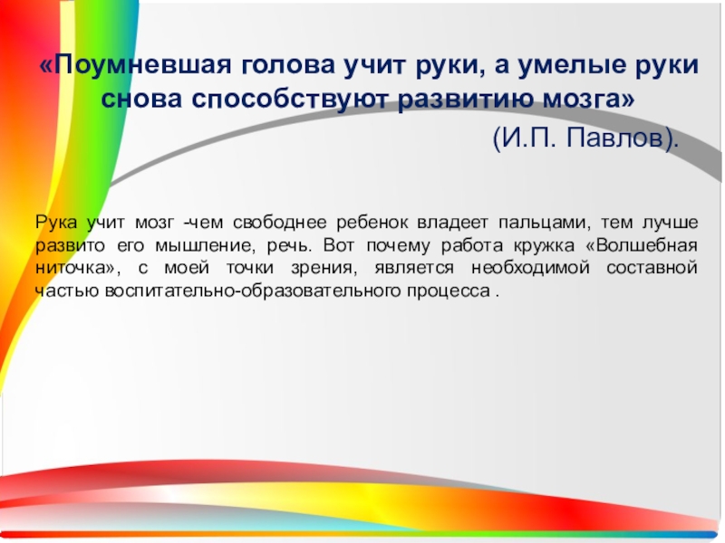 Рука учит мозг -чем свободнее ребенок владеет пальцами, тем лучше развито его мышление, речь. Вот почему работа кружка «Волшебная ниточка», с моей точки зрения, является необходимой составной частью воспитательно-образовательного процесса .