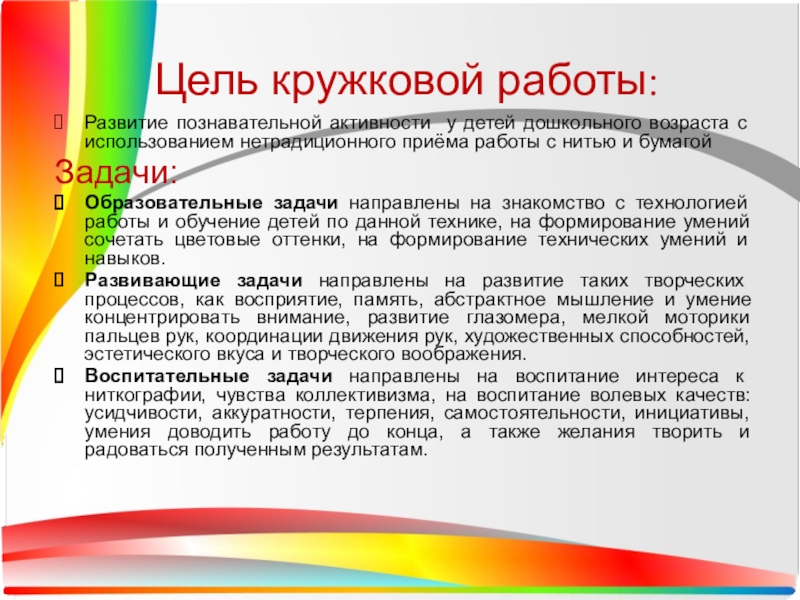 Воспитательные задачи направлены на воспитание интереса к ниткографии, чувства коллективизма, на воспитание волевых качеств: усидчивости, аккуратности, терпения, самостоятельности, инициативы, умения доводить работу до конца, а также желания творить и радоваться полученным результатам.