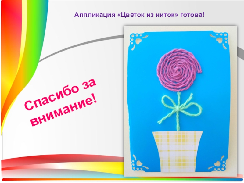 Слайд 22Аппликация «Цветок из ниток» готова!