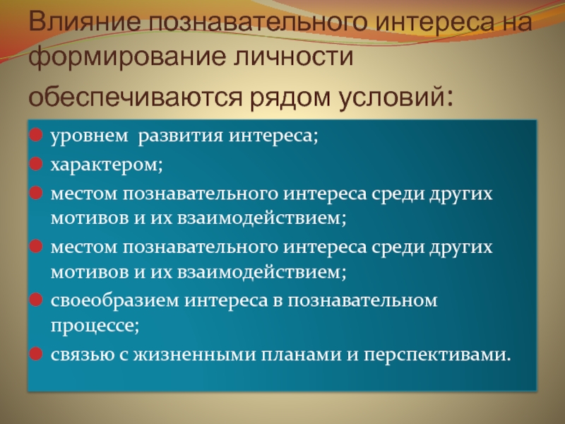 Слайд 9Влияние познавательного интереса на формирование личности обеспечиваются рядом условий: