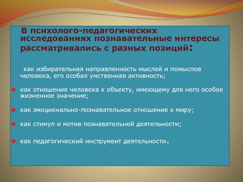 В психолого-педагогических исследованиях познавательные интересы рассматривались с разных