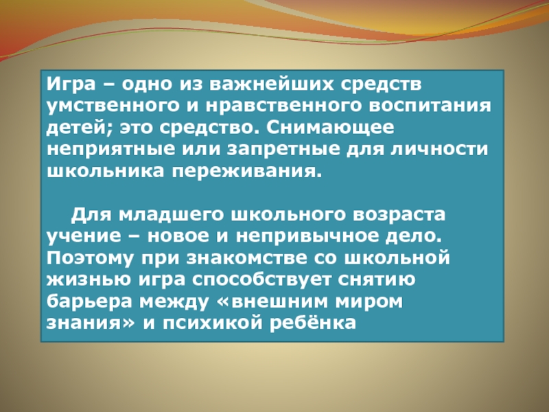 Для младшего школьного возраста учение – новое и непривычное дело. Поэтому при знакомстве со школьной жизнью игра способствует снятию барьера между «внешним миром знания» и психикой ребёнка