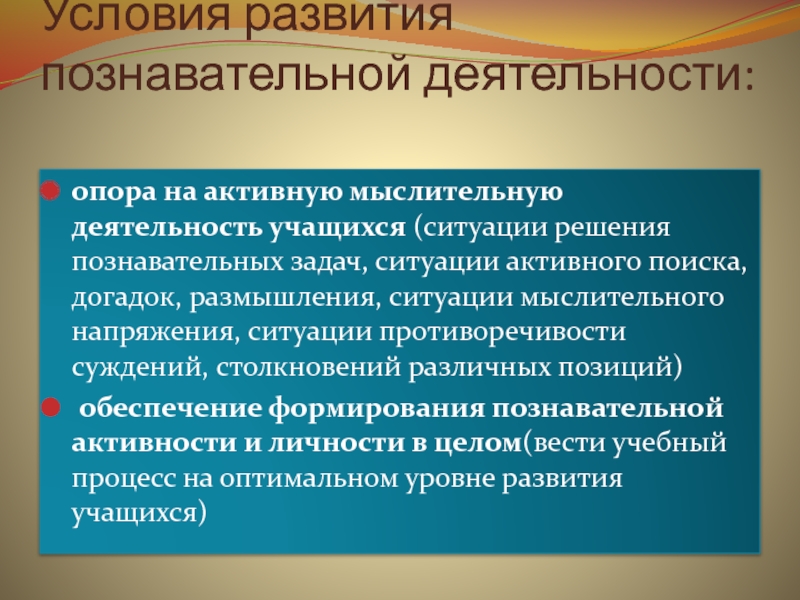 Слайд 10Условия развития познавательной деятельности: