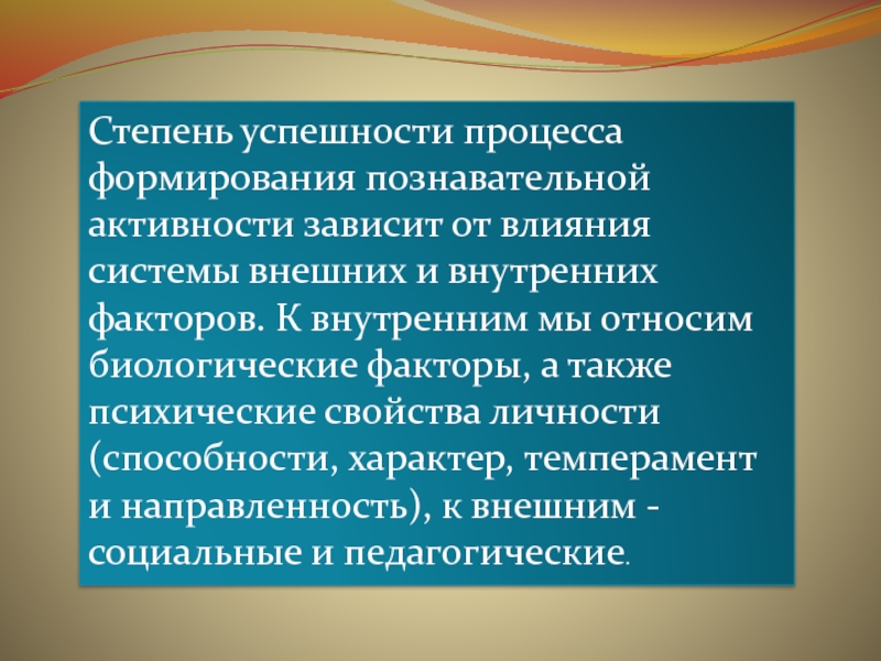 Слайд 12Степень успешности процесса формирования познавательной активности зависит от влияния системы внешних