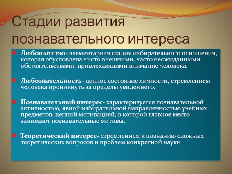 Слайд 8Стадии развития познавательного интереса
