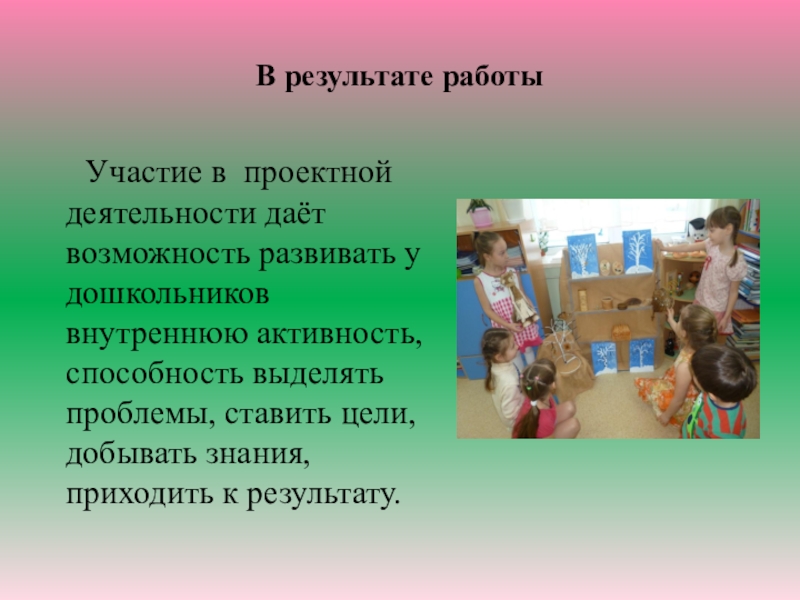 новые возможности воспитания и обучения дошкольников, и одной из наиболее эффективных в наши дни стал метод проектов. Метод проектов способствует актуализации знаний, умений, навыков ребенка, их практическому применению во взаимодействии с окружающим; стимулирует потребность ребенка в самореализации, самовыражении, в творческой личностно и общественно значимой деятельности: реализует принцип сотрудничества детей и взрослых, позволяет сочетать коллективное и индивидуальное в педагогическом процессе; является технологией, обеспечивающей рост личности ребенка, позволяет фиксировать этот рост, вести ребенка по ступенькам роста- от проекта к проекту.