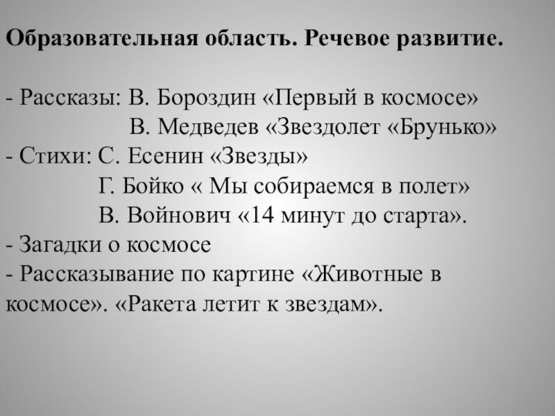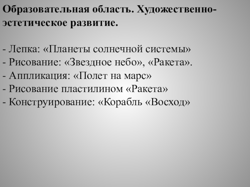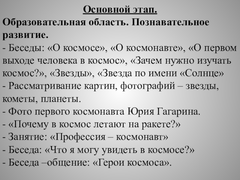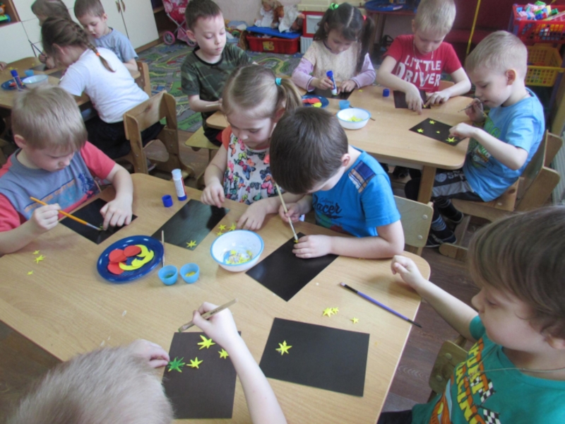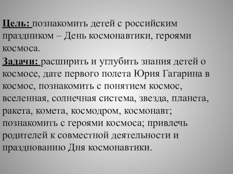 Задачи: расширить и углубить знания детей о космосе, дате первого полета Юрия Гагарина в космос, познакомить с понятием космос, вселенная, солнечная система, звезда, планета, ракета, комета, космодром, космонавт; познакомить с героями космоса; привлечь родителей к совместной деятельности и празднованию Дня космонавтики.