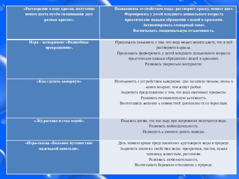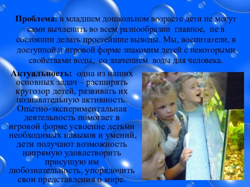 всем разнообразии главное, не в состоянии делать простейшие выводы. Мы, воспитатели, в доступной и игровой форме знакомим детей с некоторыми свойствами воды, со значением воды для человека.