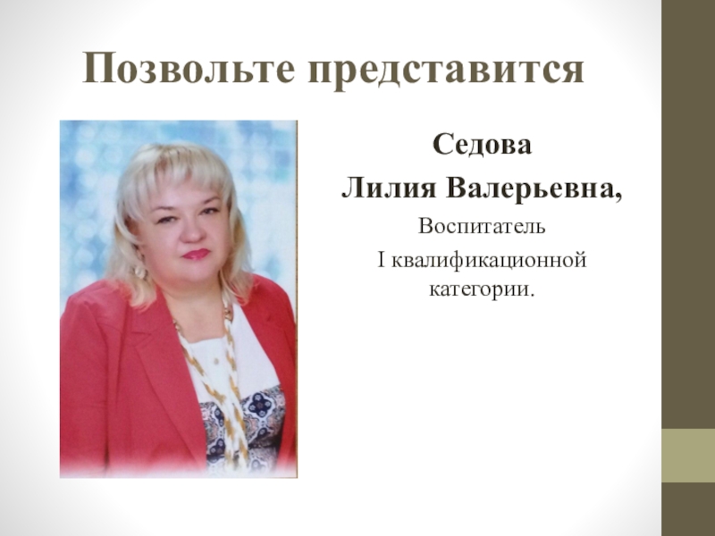Позвольте представитсяСедова Лилия Валерьевна,Воспитатель I квалификационной категории.