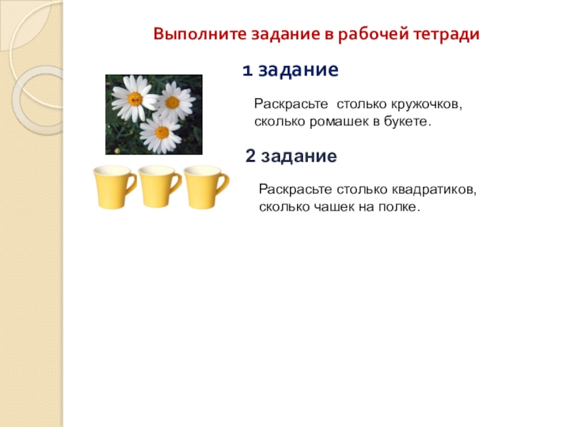 Раскрасьте столько квадратиков, сколько чашек на полке.