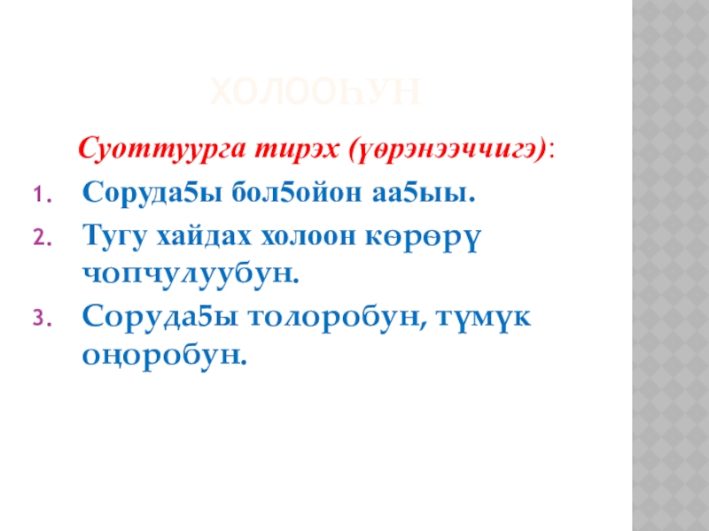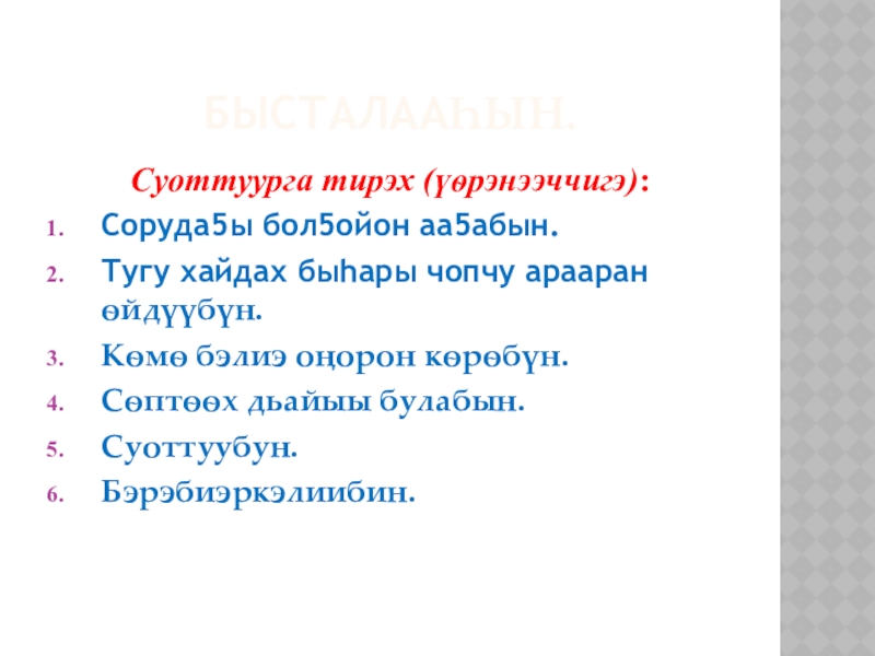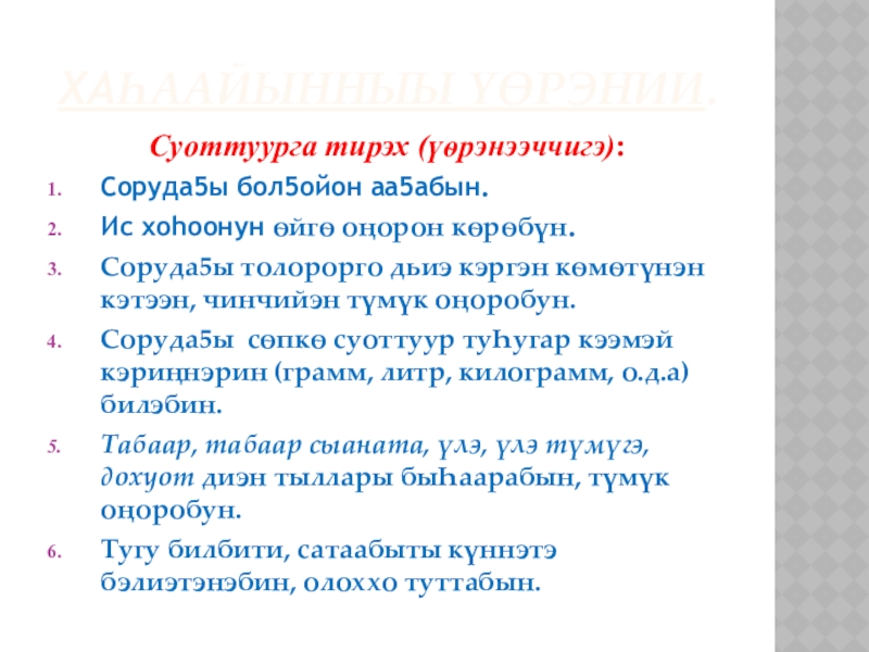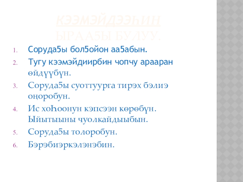 6. Холооhун: тугу эмэ чуолкай кэмнээбэккэ быhа барыллаан быhаарыы. Учууталга, куруhуок салайааччытыгар бэйэтэ ситэрэн – хоторон үлэлииригэр анаан, сатабыл бу кѳрүңнэригэр а5ыйах сорудах киирдэ.