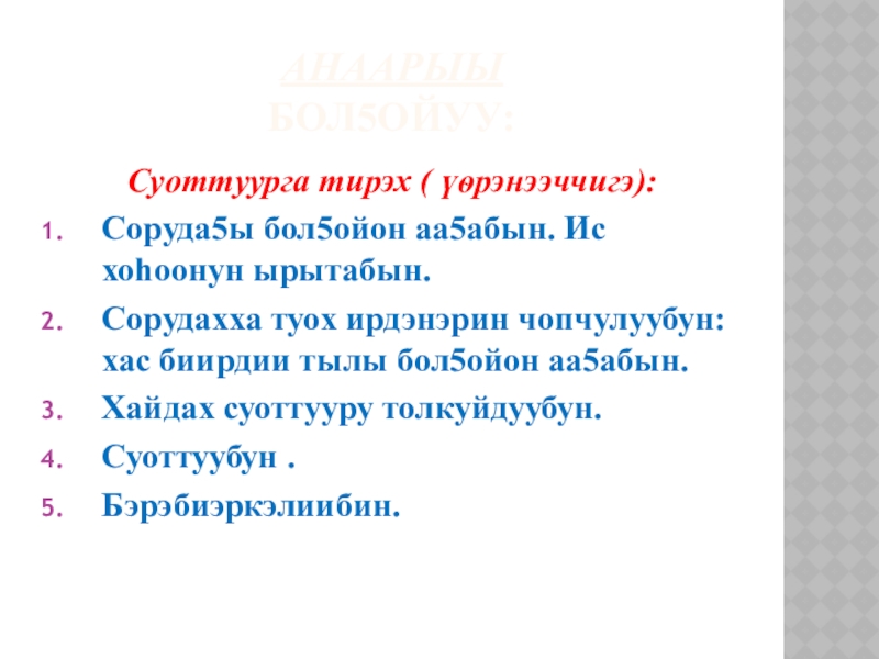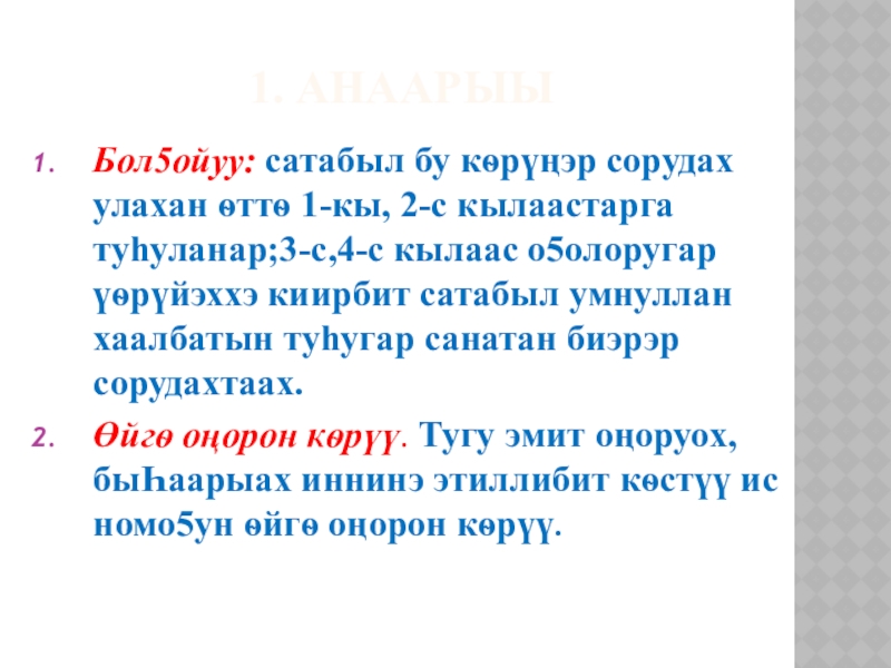 1. Соруда5ы бол5ойон аа5абын.