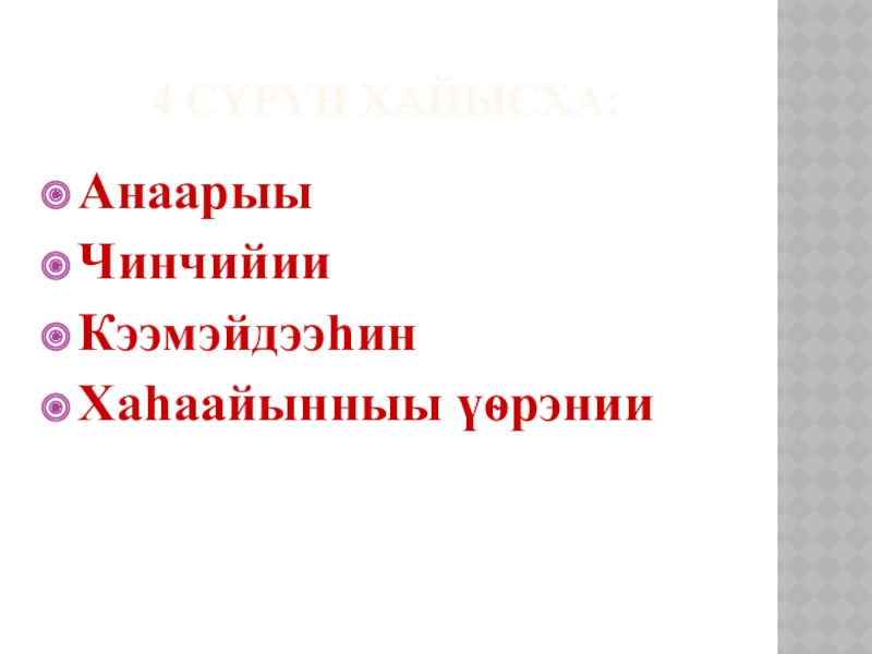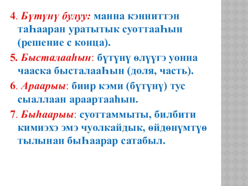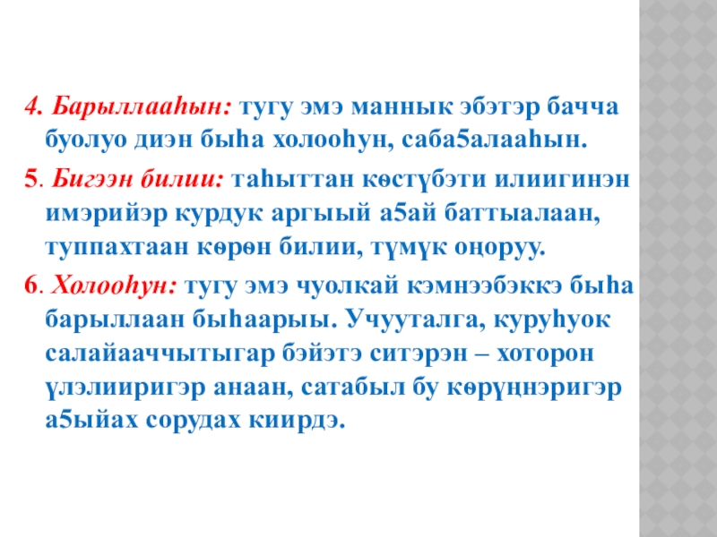 4. Барыллааhын: тугу эмэ маннык эбэтэр бачча буолуо диэн быhа холооhун,
