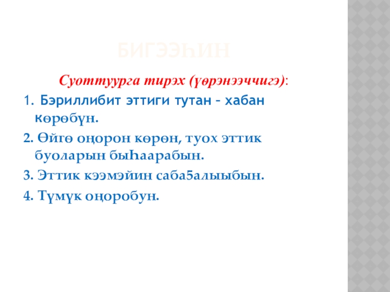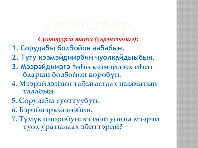 2. Мээрэйдээhин: уба5ас эттик уратытын ѳйдүүр, ону сѳпкѳ мээрэйдиир сатабыл.