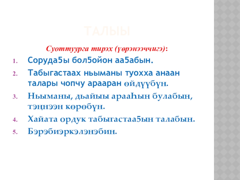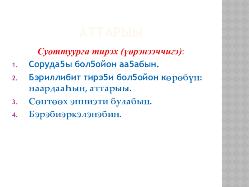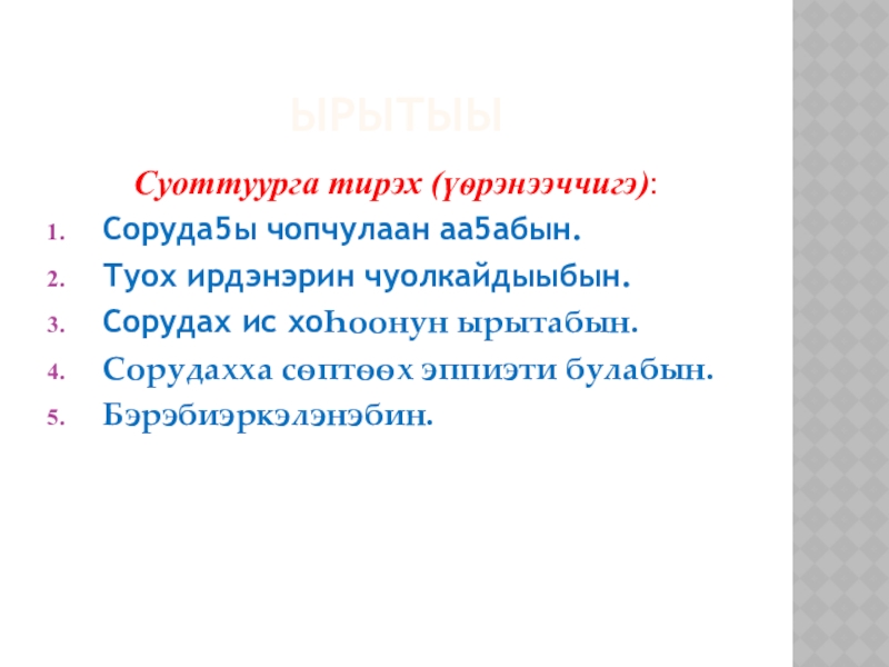 Слайд 67. Ырытыы: бары ѳттүнэн ырыңалаан, аттаран толкуйдааhын.