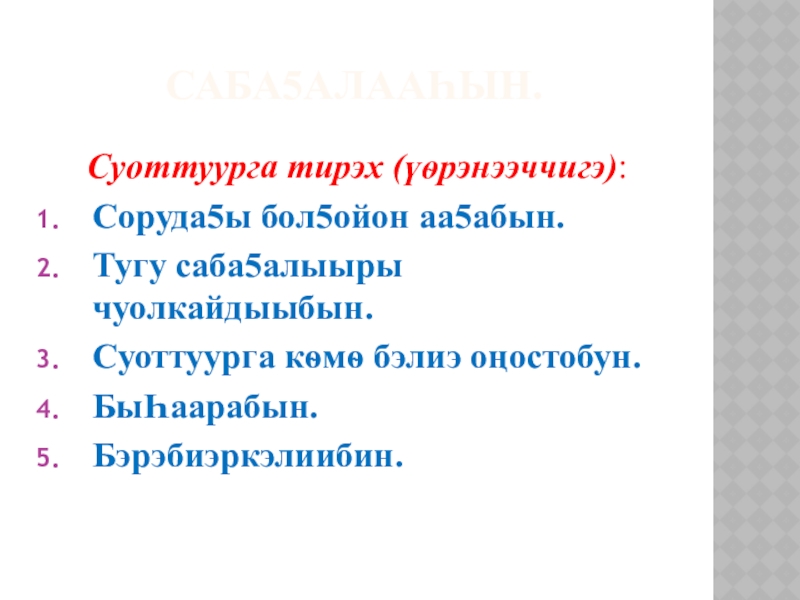 Саба5алааhын: чуо быhааарар буолбакка, сэрэйэ былаастаан, бадахтаан ѳйдѳѳҺүн