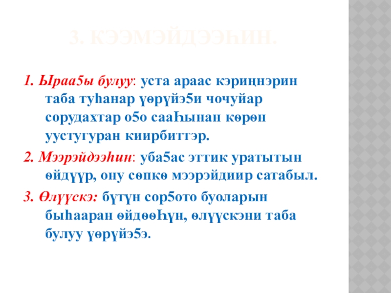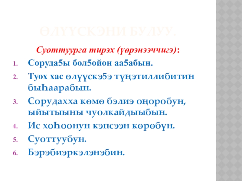3. Өлүүскэ: бүтүн сор5ото буоларын быhааран ѳйдѳѳҺүн, ѳлүүскэни таба булуу үѳрүйэ5э.
