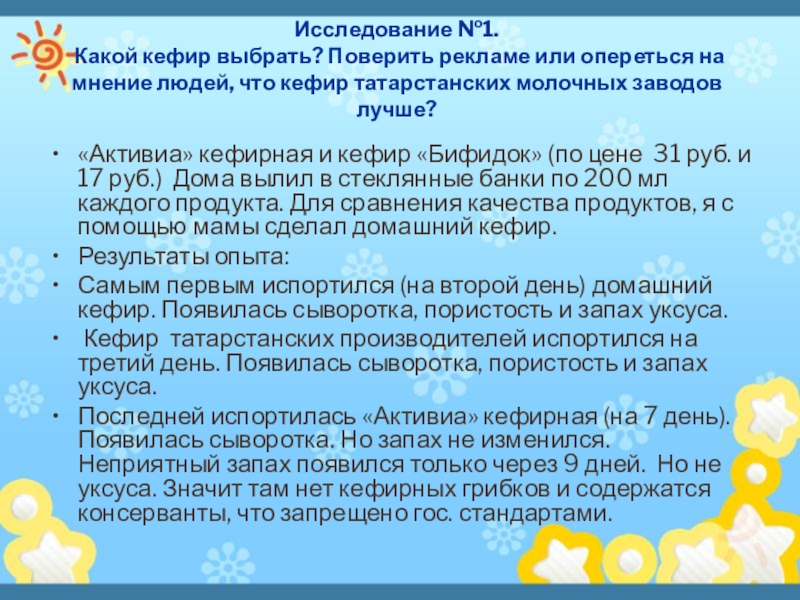 Последней испортилась «Активиа» кефирная (на 7 день). Появилась сыворотка. Но запах не изменился. Неприятный запах появился только через 9 дней. Но не уксуса. Значит там нет кефирных грибков и содержатся консерванты, что запрещено гос. стандартами.